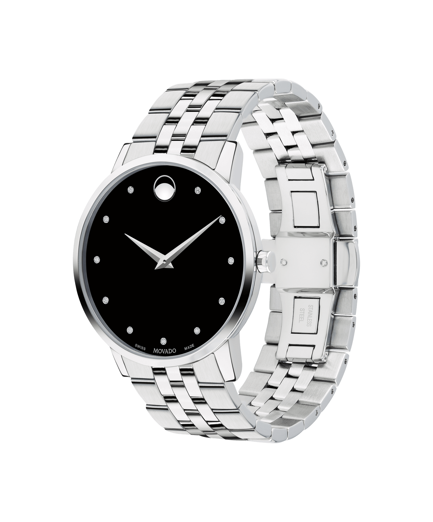 Men's Museum Classic watch, 40 mm stainless steel case, round black dial with 11 diamond markers (0.043 t.c.w.) and silver-toned dot and hands, stainless steel link bracelet with deployment clasp.