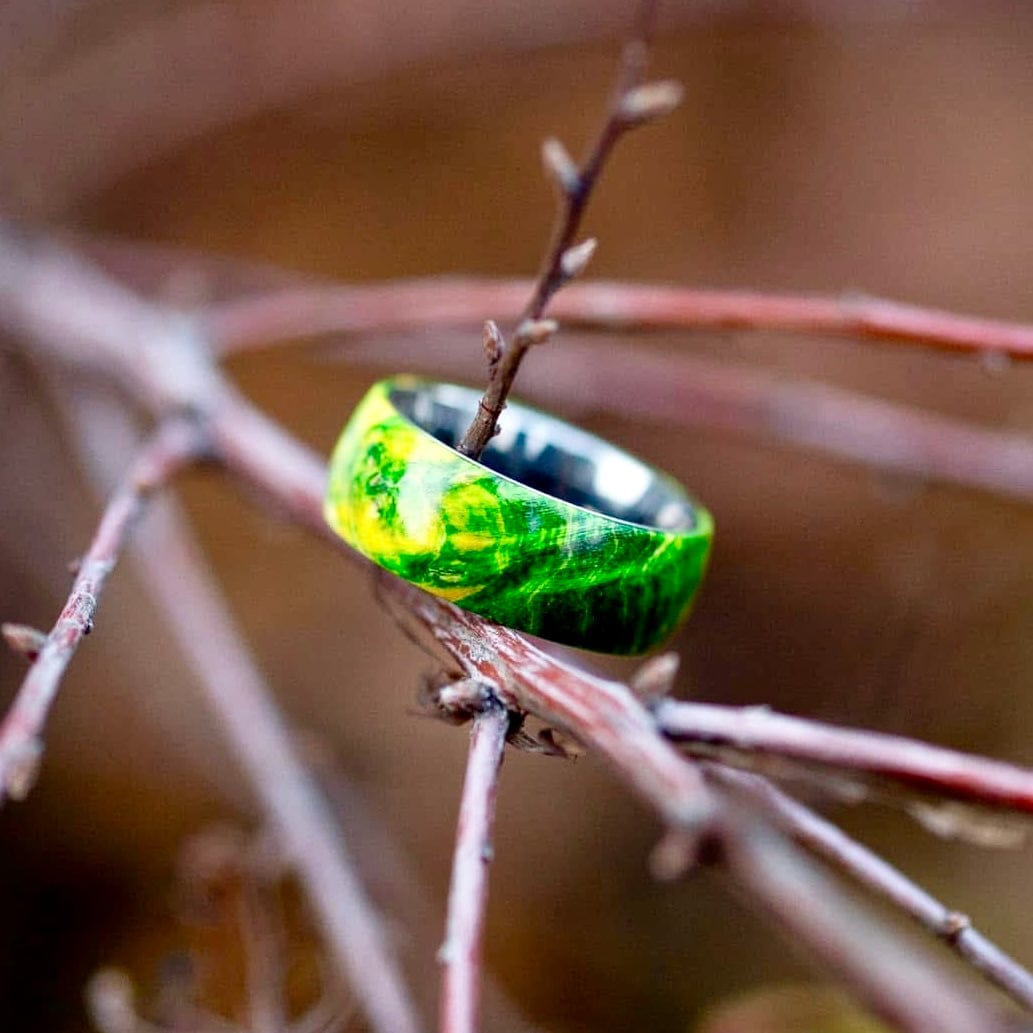 Un bois à croissance rapide durable, et infusé de résine colorée. Pour prendre des apparences différentes pour chaque pièce.
