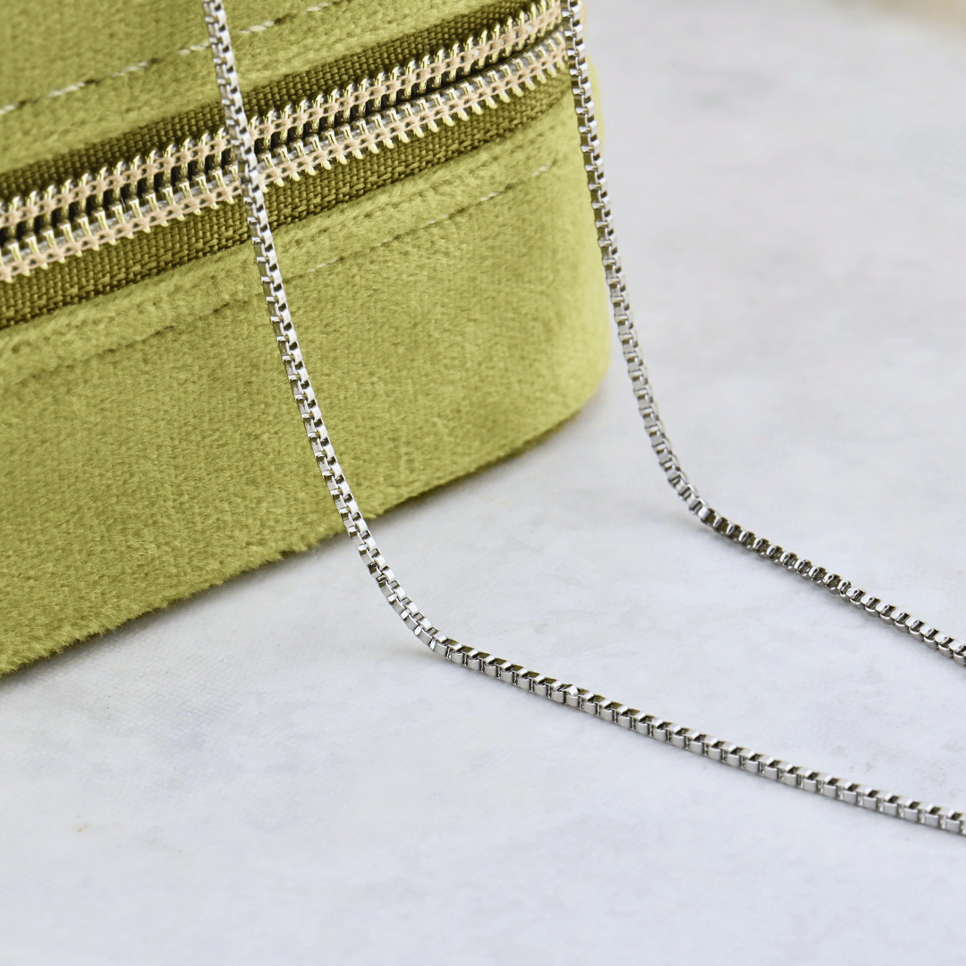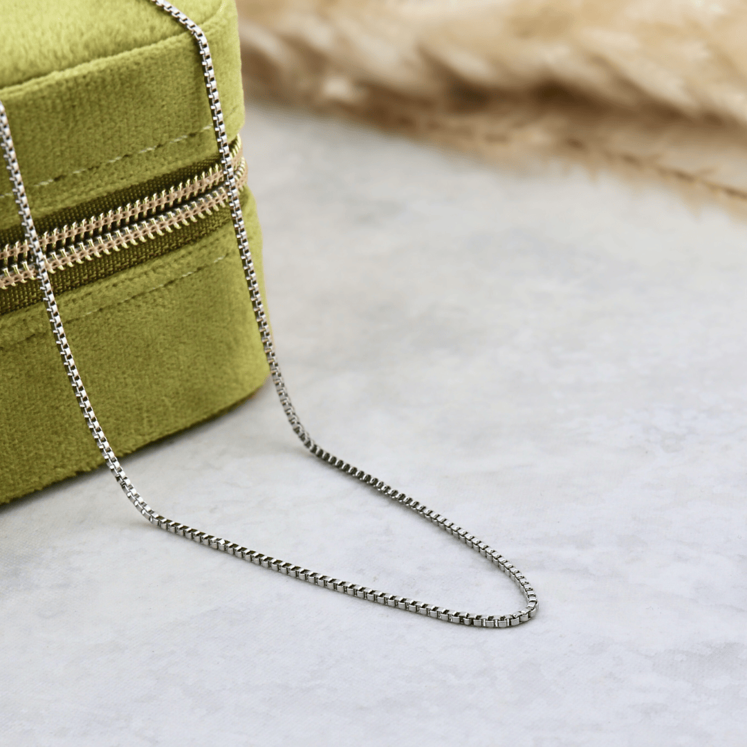 Box chain in stainless steel, slim and understated. A versatile essential, perfect worn alone or layered for everyday style.