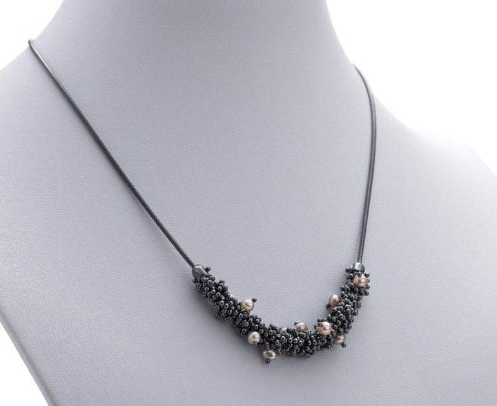 Necklace with four inches from shikshok in oxidized silver and rosy pearls